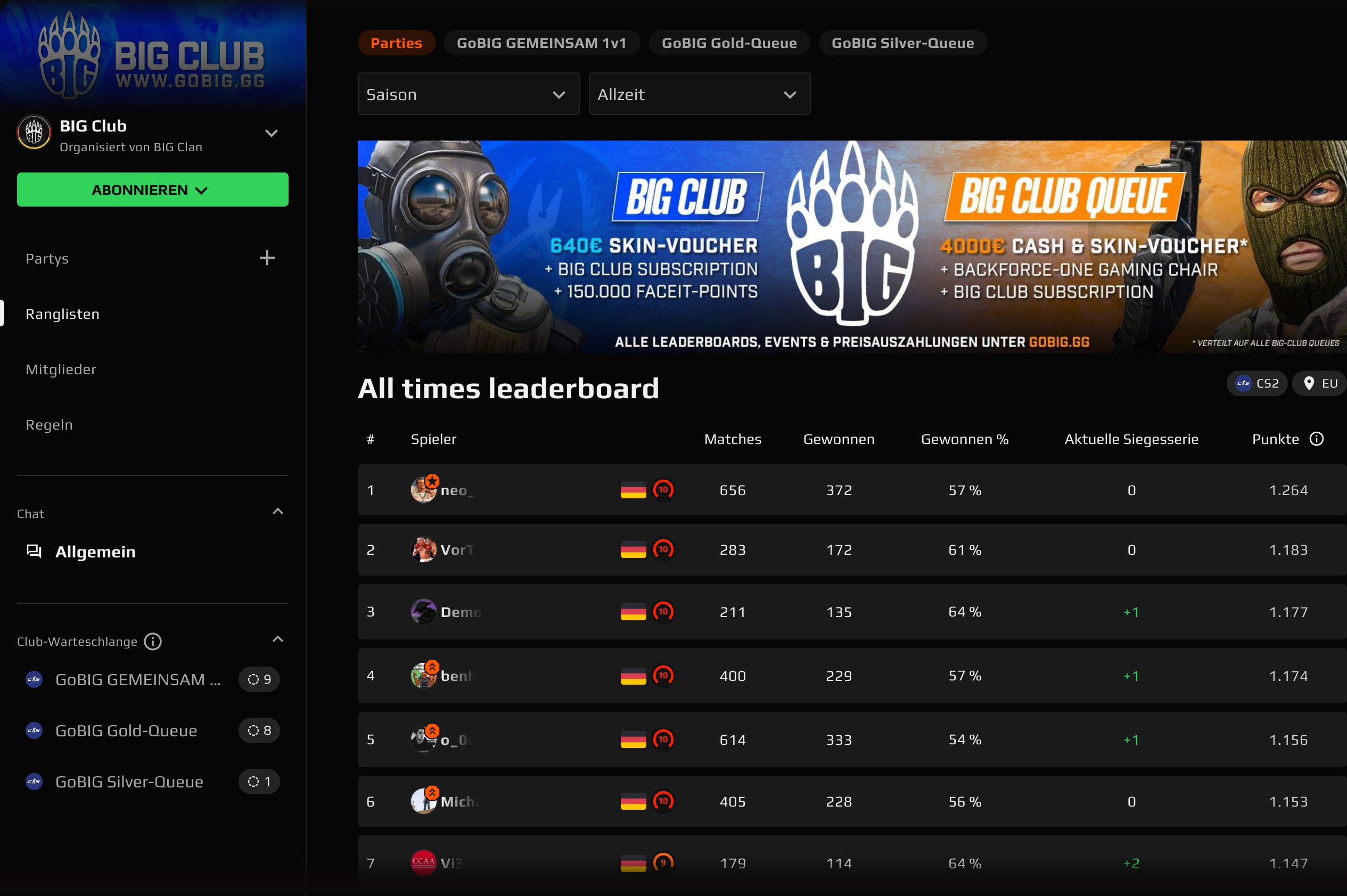 - Dank dem Faceit Anti-Cheat spielst du in unserem Club faire Matches mit der größten deutschsprachigen Community. Mit einer BIG Club Party nimmst du am regulären Faceit CS2 Matchmaking teil, hast die Chance auf zahlreiche Preise in unseren Club-Leaderboards und sammelst gleichzeitig Punkte für die beliebten Faceit-Missionen!